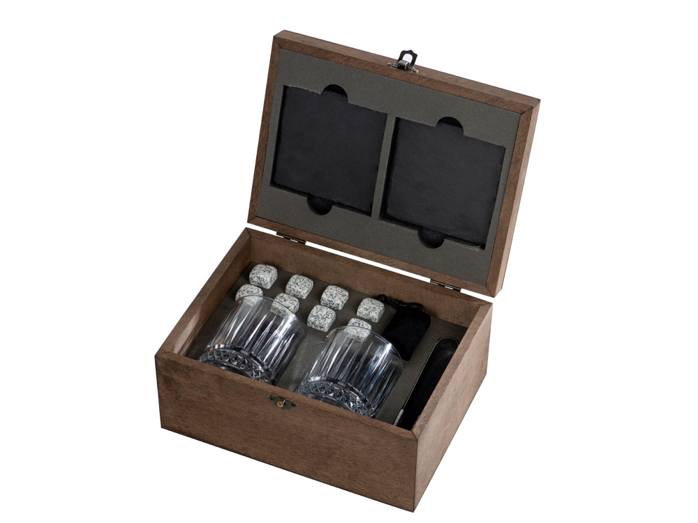 Набор для виски Jack состоит из двух стаканов с толстым дном, охлаждающих камней в мешочке, удобных щипцов и двух лаконичных костеров из сланцевого камня. Сет упакован в деревянную подарочную шкатулку, которая создает праздничное настроение еще до того, как вы откроете крышку. Более того, это уже готовый набор для подарка. Талькохлоритные камни не царапают бокал, не разбавляют напиток, не впитывают цвет и запах напитка. Ими легко пользоваться: просто поместите их в морозильную камеру за несколько часов до откупоривания виски. При желании после использования камни можно хранить в бархатном мешочке, который также можно забрендировать. Щипцы из стали помогут аккуратно разложить камни по бокалам, при этом не разбив их и не расплескав напиток. - рельефные бокалы из стекла - можно дарить: поставляется в красивой шкатулке с качественным ложементом - камни не впитывают цвет и запах напитка - щипцы позволят удобно зацепить камни - сланцевые костеры защитят поверхность стола от царапин, следов и перепадов температур Гравировка (CO2 лазер) (Без чернения) на данный товар осуществляется бесплатно. Оплачивается только настройка оборудования в размере 1100 рублей на весь тираж.