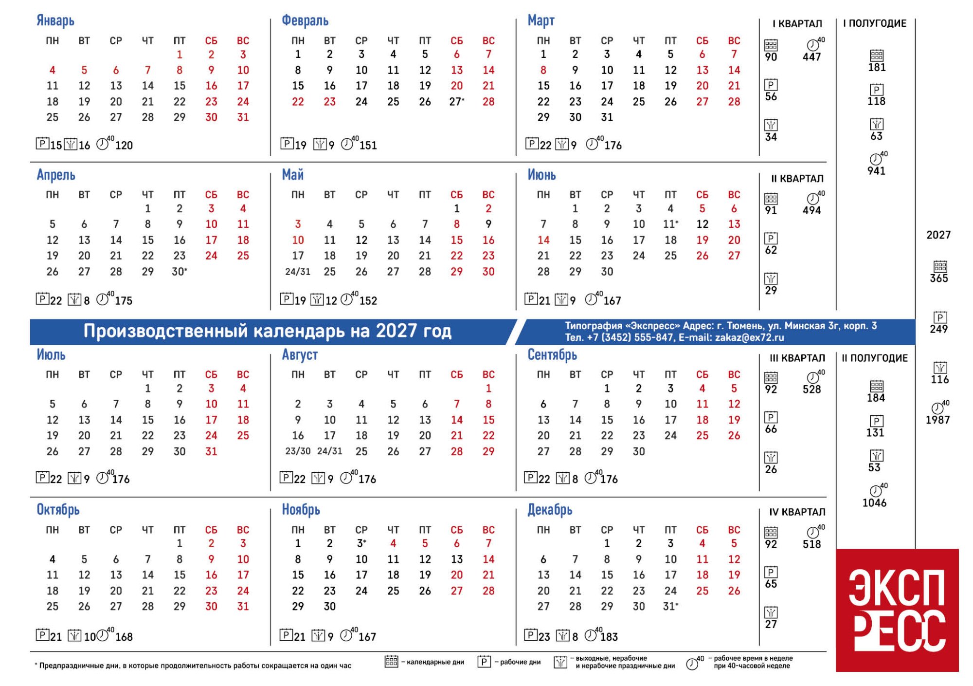 Производственный календарь (иногда сокращенно - ПК) на 2027 год с выходными и праздничными днями является важным рабочим материалом российских кадровиков и бухгалтеров. Каждый год мы готовим для вас производственный календарь удобный для работы. Наша кадровая служба и бухгалтерия выступают в роли приемщиков работы наших дизайнеров. Поэтому можете быть уверены для вас производственный календарь на 2027 год сделан как для себя.