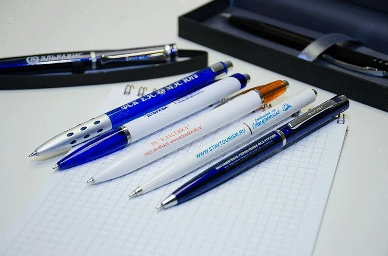 Печать на ручках выполняется с учетом того, чтобы краска долго не стиралась, и чтобы логотип был виден, когда используется ручка. Именно поэтому слоганы и изображения наносят на верхнюю часть ручки или на клип.
